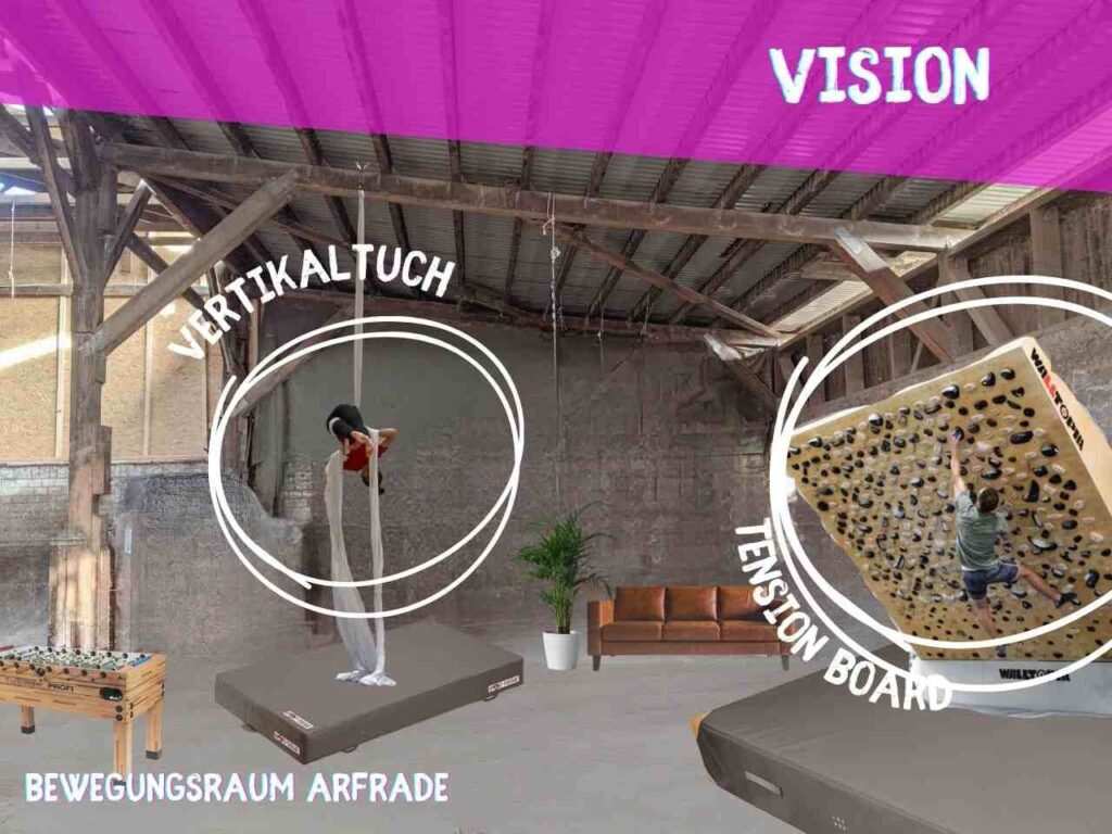 Die große Idee, hinter Allem ist zukünftig einen weiteren Bewegungsraum zu schaffen, in dem unterschiedliche Sportarten (Aerial Tuch, Tanzflächen, Yoga…) ausgeübt werden können. Unsere Kletterwand ist der Startschuss und zieht dann mit in den Bewegungsraum um.